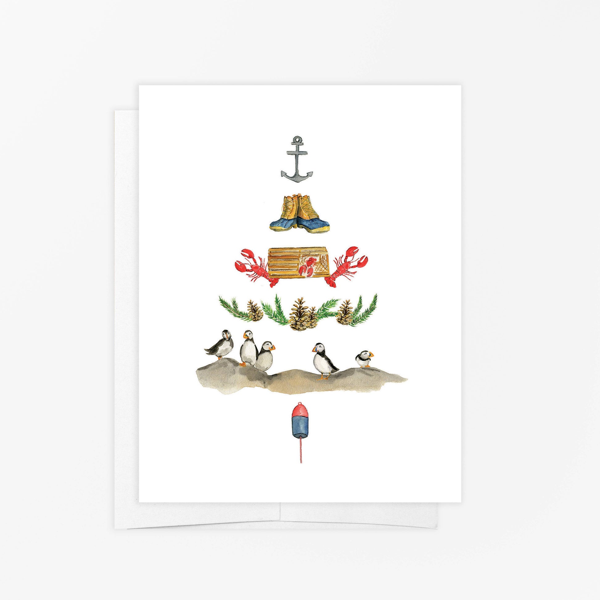 Celebrate the season with coastal charm! Our New England Tree holiday card features a watercolor Christmas tree built from iconic Maine elements—an anchor topper, classic L.L. Bean boots, lobster traps with lobsters, pinecones, evergreen branches, puffins, and a buoy base. This whimsical design captures the heart of a New England Christmas and is a customer favorite for coastal shops and boutiques.