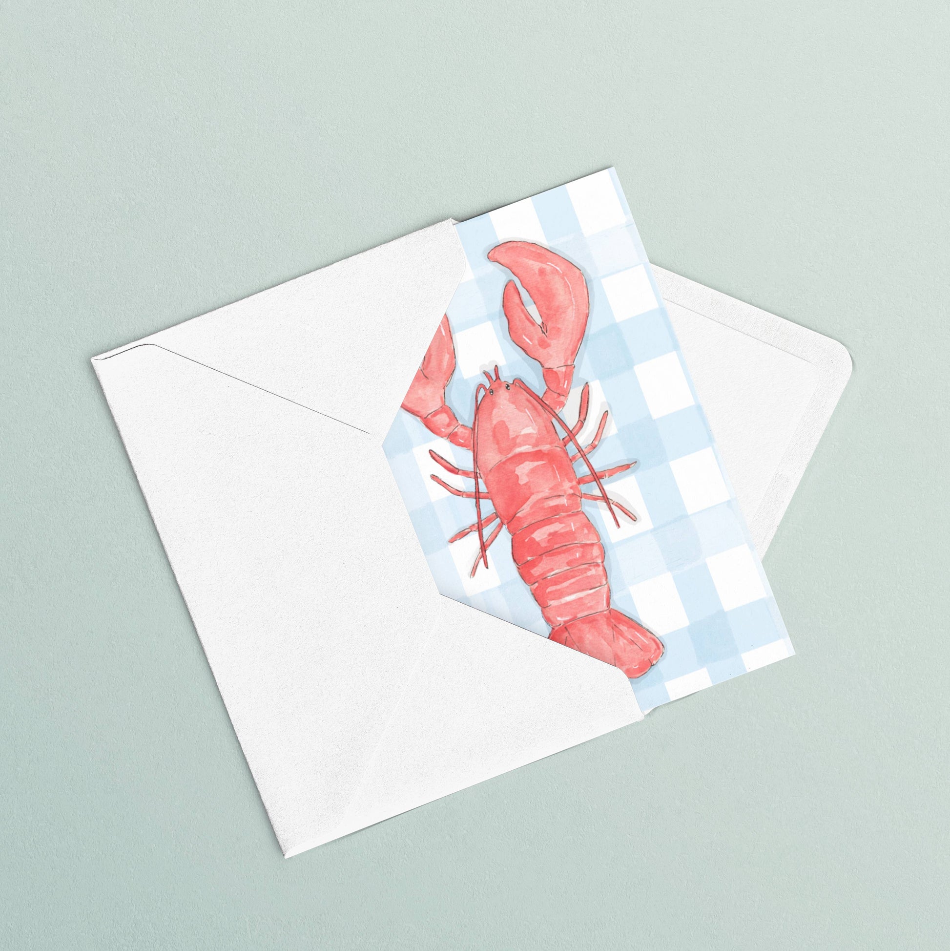llustration of a bright red lobster set against a cheerful picnic-blue background. Measuring 3.5" x 2.5" when folded, each card is blank inside—perfect for jotting down quick thank-yous, heartfelt hellos, or gift enclosures with personality.